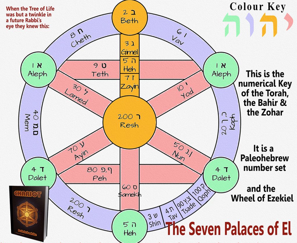 Academics today generally hold any sort of gematria in disrepute, having lazily assessed the wrong numerical values and inevitably found them wanting, but to date there has been no study of the gematria of the Merkabah, and therefore scholars have nothing to say on the matter. Nevertheless there have been better scholars that believe there is gematria in the bible[4], and they trace the origins of the practice to Mesopotamia where it was first used with the cuneiform script. The gematria of the Merkabah was first discovered in the last century by the self styled occult magician ‘Aleister Crowley’ and by myself in 2014 after a careful study of the Zohar’s ‘Book of Concealed Mystery’ which contains a riddle – the solving of which reveals the Seven Palaces[5]. This diagram is an alpha-numeric logo-graphic arrangement. It contains the letters of the Hebrew alphabet assigned to Palaces (similar to sephiroth) and Paths, and it allows us to decipher the hidden gematria of the Merkabah [6]: